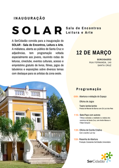 No primeiro bate-papo SOLAR, recebemos os escritores André Mansur e Felipe Cerquize, que trouxeram curiosidades sobre Santa Cruz e falaram sobre a importância do bairro na história da cidade. Também tivemos uma oficina de escrita criativa com Luiz Vaz, escritor e curador do SOLAR, Marcyele Duarte, poeta e ex-aluna da SerCidadão e o escritor Severino Honorato.